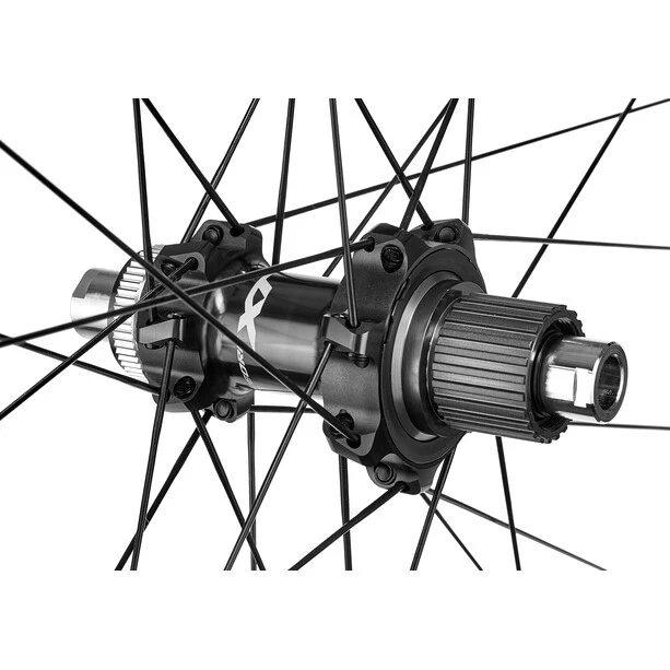 Les roues XT de la gamme XC sont dotées de jantes tubeless de 24 mm de large avec un puits de jante complètement fermé. La jante en aluminium est à la fois légère et rigide, 28 rayons droits à double butée assurent un équilibre entre la rigidité et le poids de la roue entière. Le corps de roue libre MICRO SPLINE est utilisé sur le moyeu arrière.