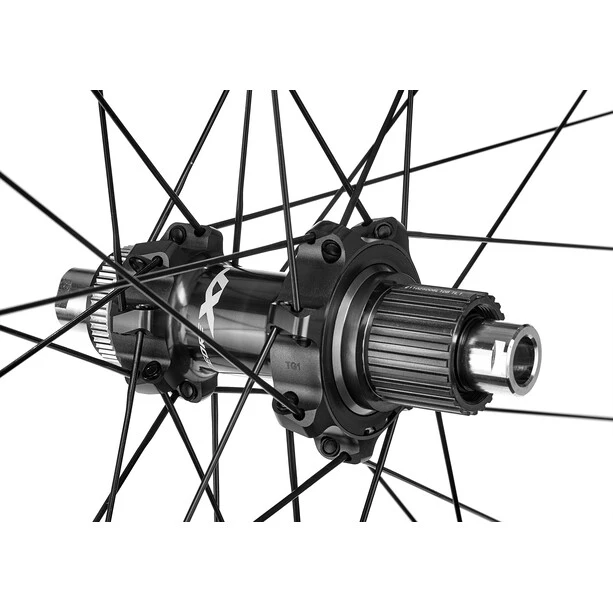 Les roues XT de la gamme XC sont dotées de jantes tubeless de 24 mm de large avec un puits de jante complètement fermé. La jante en aluminium est à la fois légère et rigide, 28 rayons droits à double butée assurent un équilibre entre la rigidité et le poids de la roue entière. Le corps de roue libre MICRO SPLINE est utilisé sur le moyeu arrière.